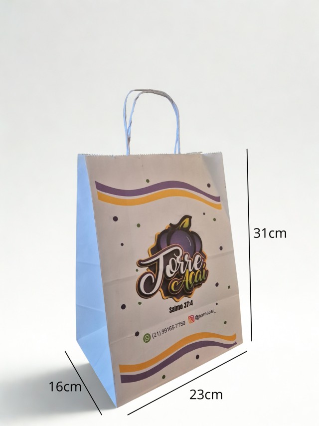 Sacola de Papel Branco com Alça GG (23cm largura × 31cm altura × 16cm fundo) – Impressão Colorida Ilimitada