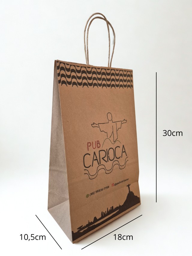 Sacola Kraft M com Alça Torcida – (18cm largura × 30cm altura × 10,5cm fundo) | Impressão Colorida Livre